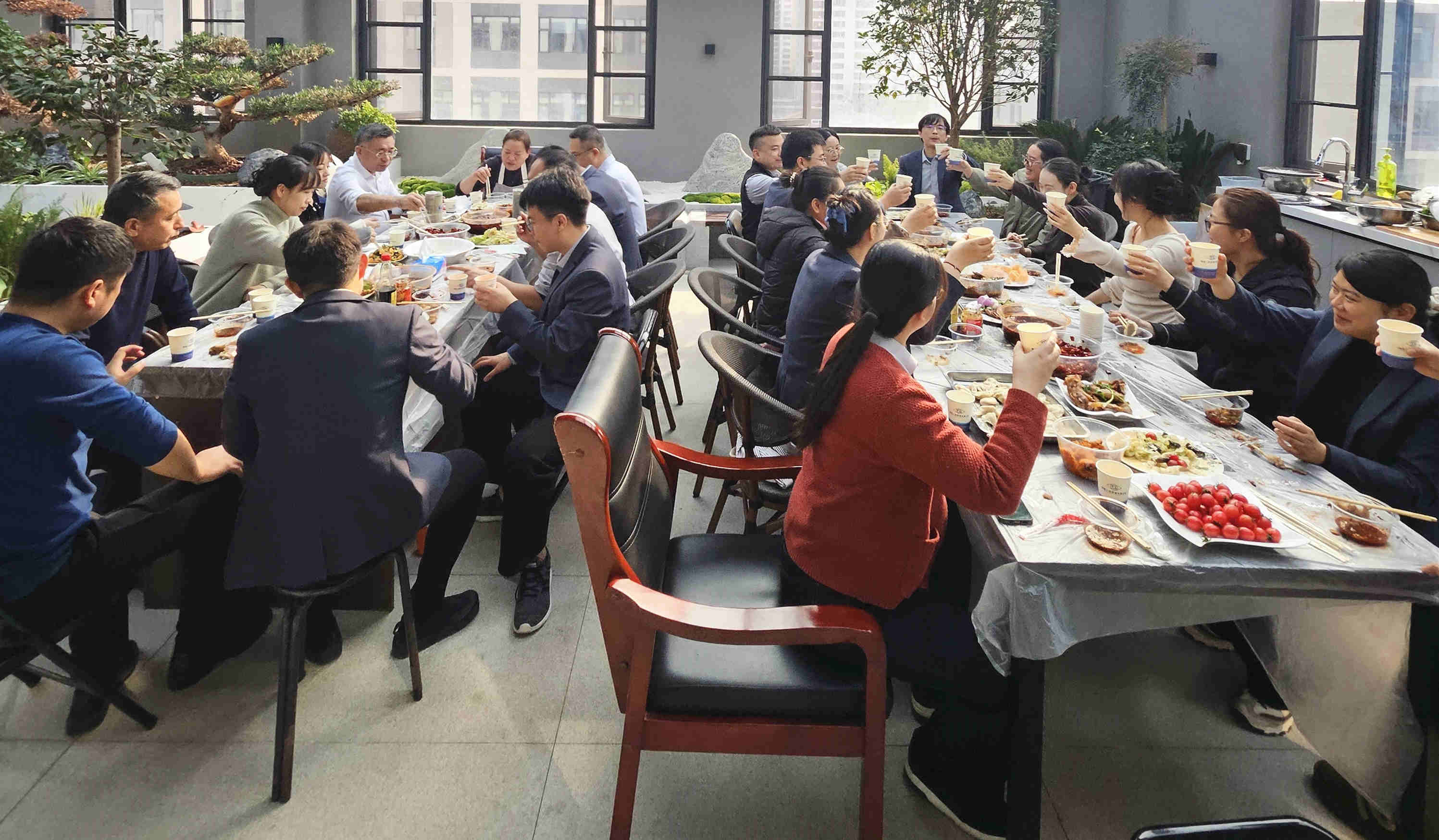清水飄芙蓉,元寶落玉盤。熱氣騰騰的餃子陸續(xù)出鍋,誘人的香氣彌漫開來。員工們圍坐在一起,品嘗著親手制作的美味成果,醋香、辣油各取所愛,咬一口餃子,暖意從舌尖直達心底,瞬間驅散了冬日的寒意。大家一邊享用美食,一邊分享工作趣事,這一刻,忙碌的工作壓力煙消云散,取而代之的是節(jié)日的喜悅和滿滿的歸屬感。