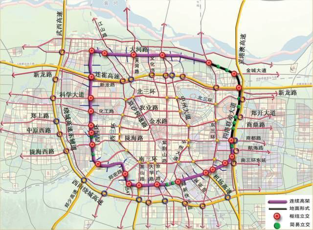 鄭州市四環(huán)線及大河路快速化工程為由大河路、東四環(huán)、南四環(huán)及西四環(huán)組成閉合環(huán)線,路線全長(zhǎng)約93.030km。全線采用城市快速路路標(biāo)準(zhǔn),規(guī)劃控制總寬度180m(其中道路紅線寬80m,兩側(cè)各有50m寬綠化帶),西西四環(huán)、大河路(107輔道以西段)、南四環(huán)采用高架快速路形式,標(biāo)準(zhǔn)橫斷面組成為:高架快速路(雙向八車道)+地面主干路(雙向八車道)+輔路:大河路(107輔道以東段)、東四環(huán)采用地面快速路形式,標(biāo)準(zhǔn)橫斷面組成為:主線地面快速路(雙向十車道)+輔路。全線高架快速路長(zhǎng)63.624km(新建56.536km,現(xiàn)狀7088km),地面快速路長(zhǎng)29.406km;共設(shè)置27座互通立交,其中新建立交15座(改造現(xiàn)狀立交7座,利用現(xiàn)狀立交5座),37對(duì)上下匝道,8座隧道(下穿通道);全線與河(渠)交叉21處,與鐵路交叉12處(其中下穿高鐵8處,上跨普鐵4處),與軌道交通線交叉22處。